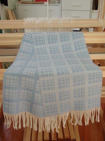 | This scarf is woven of 60/2 silk at 48 EPI, 65 PPI. There are 728 ends total. It is a two-block, broken twill. I have completed another scarf of the same design using white silk for the weft as well as the warp. The width at the reed is 13.5" and the finished width after washing is 13". The fringed ends are hemstitched with 4 threads per group. |